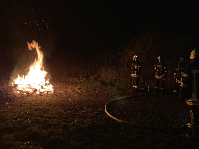 Am Mittwochabend, beim wöchentlichen Dienst, wurden wir zu einem Feuer auf ein abgelegendes Gelände in Apelern gerufen. Beim Eintreffen der Einsatzstelle sahen wir einen größeren Holzhaufen in Vollbrand. Schon bei der Alarmierung durch einen Kameraden der Feuerwehr und bei der Anfahrt ohne Sondersignal wurde uns klar, dass es sich hierbei im eine Übung handelt.