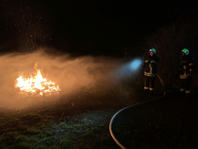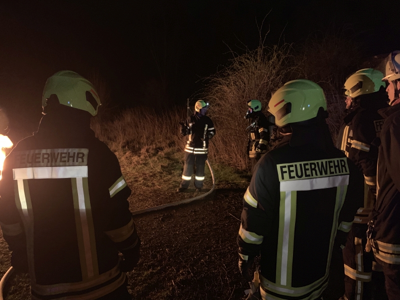 Wie bereits in vorherigen Diensten besprochen, bauten wir die Wasserversorgung von der Pumpe, die von unserem GW (Gerätewagen) in 100m entfernung stand, zum LF (Löschgruppenfahrtzeug) zum Brandherd auf. Bevor es ans Löschen ging, wurden einige wichtige Themen nochmals besprochen z.B. Atemschutz, Organisation und Löschtechnik. Beim Thema Atemschutz wurde besprochen warum es wichtig ist eine unabhängige Luftversorgung zu haben, was passiert wenn man gifitge Dämpfe einatmet, der eigentlich Angriffsvorgang mit dem Hohlstrahlrohr und das stoßweise Löschen mit diesem.