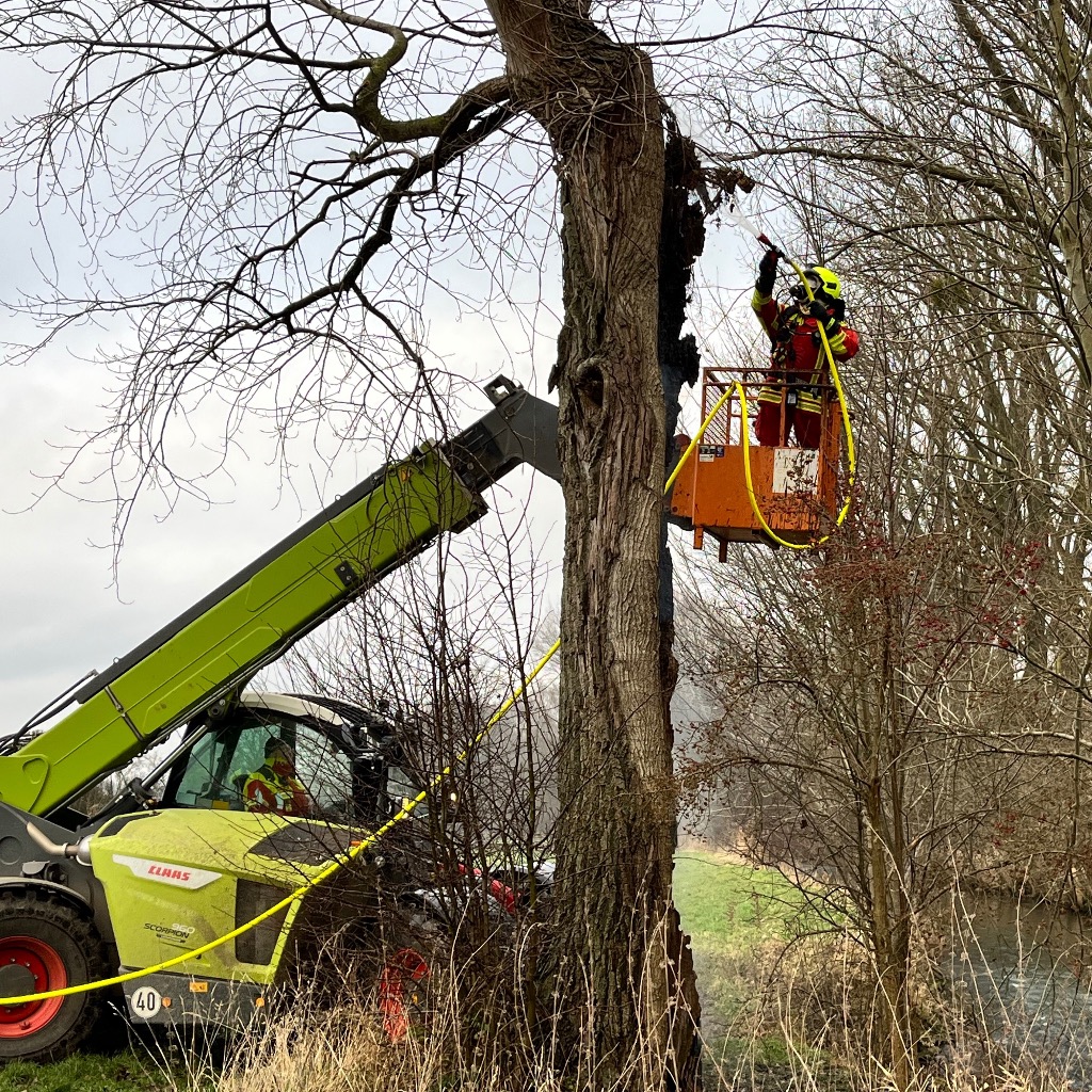 Dank der Unterstützung eines Landwirts, der uns mit einem Teleskoplader samt Korb zur Seite stand, konnten wir den Brand im Inneren des Baumes gezielt bekämpfen. Dabei setzten wir ein D-Rohr und eine Löschlanze ein, um die Glutnester effektiv zu löschen.