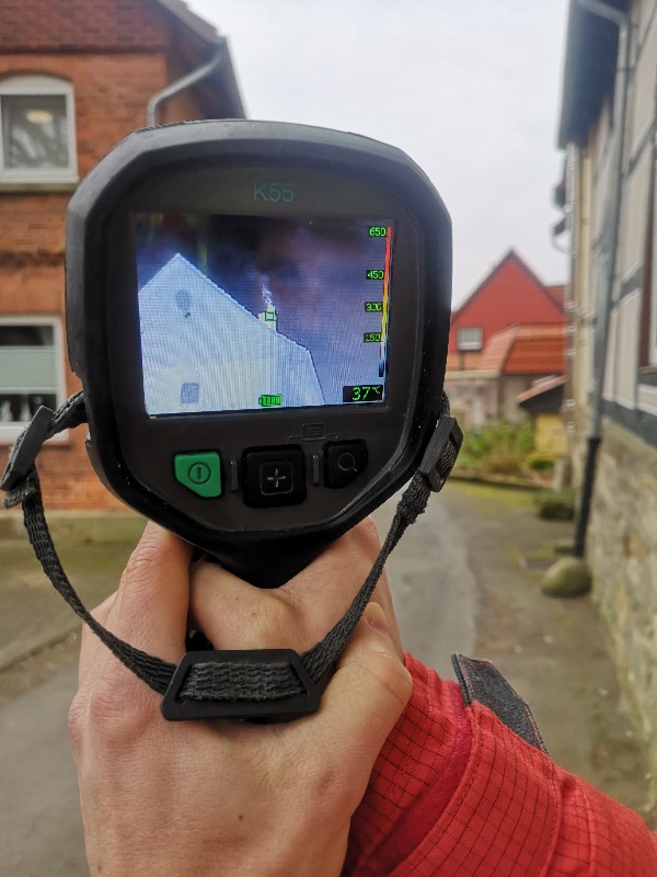 Ein Trupp ging in das Gebäude unter Atemschutz, um mit einer Wärmebildkamera die Hitzeentwicklung des Schornsteins zu kontrollieren.