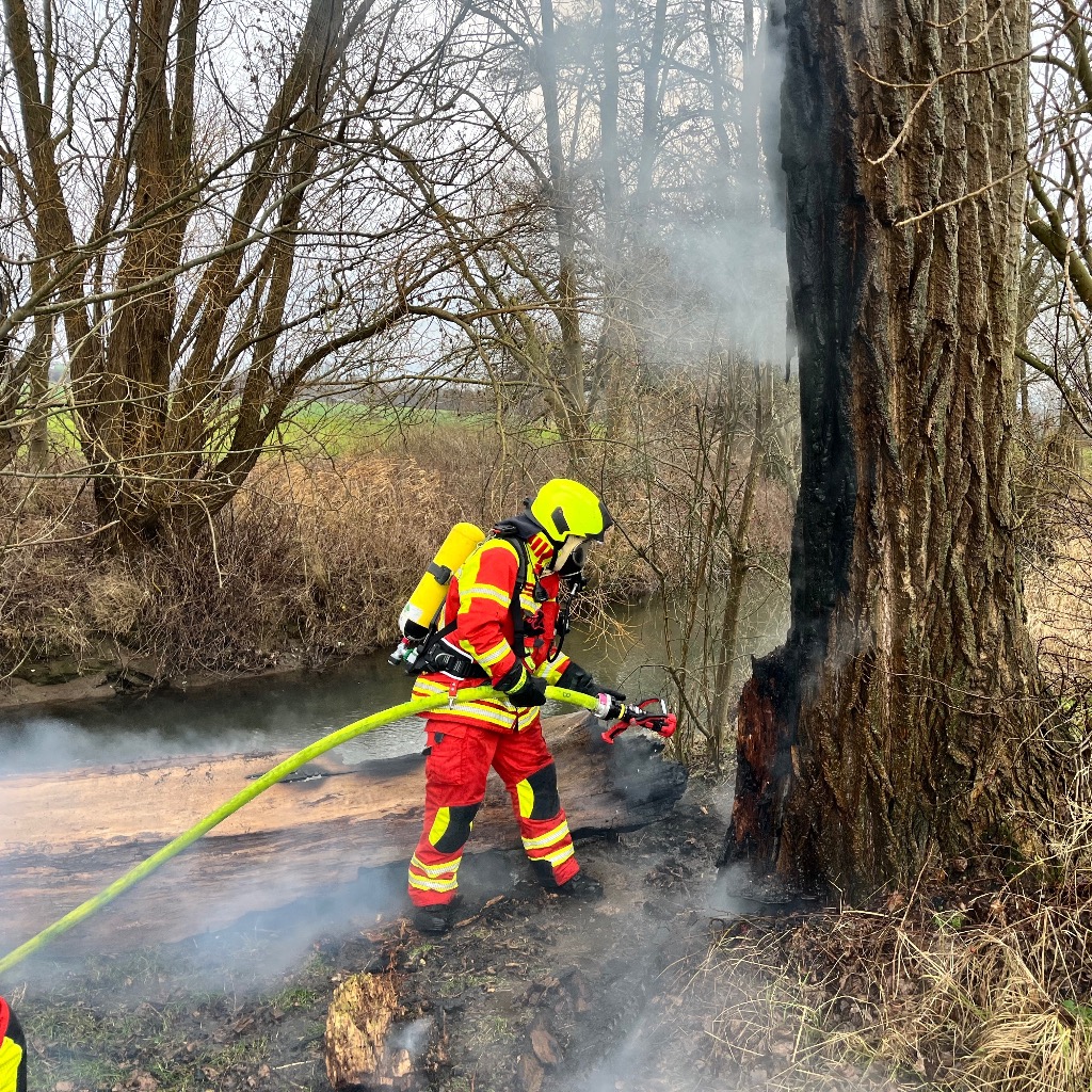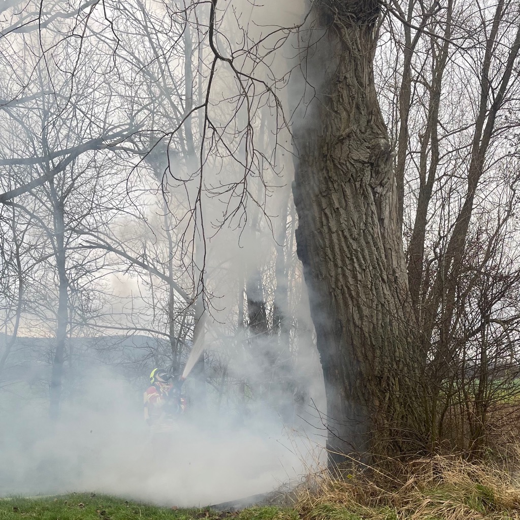 Mit einem zügigen Einsatz des C-Rohres konnte das sichtbare Feuer schnell unter Kontrolle gebracht und rasch gelöscht werden. Doch der Baum brannte weiterhin im Inneren.