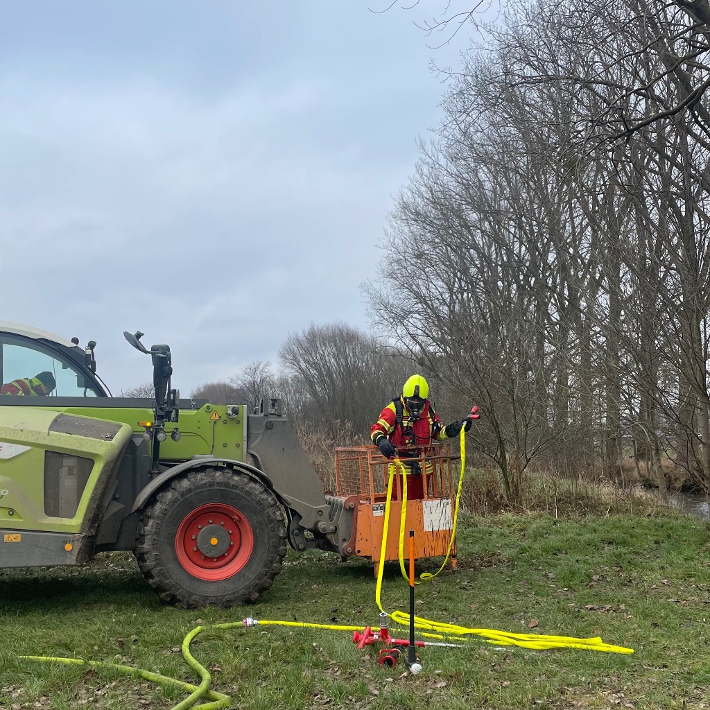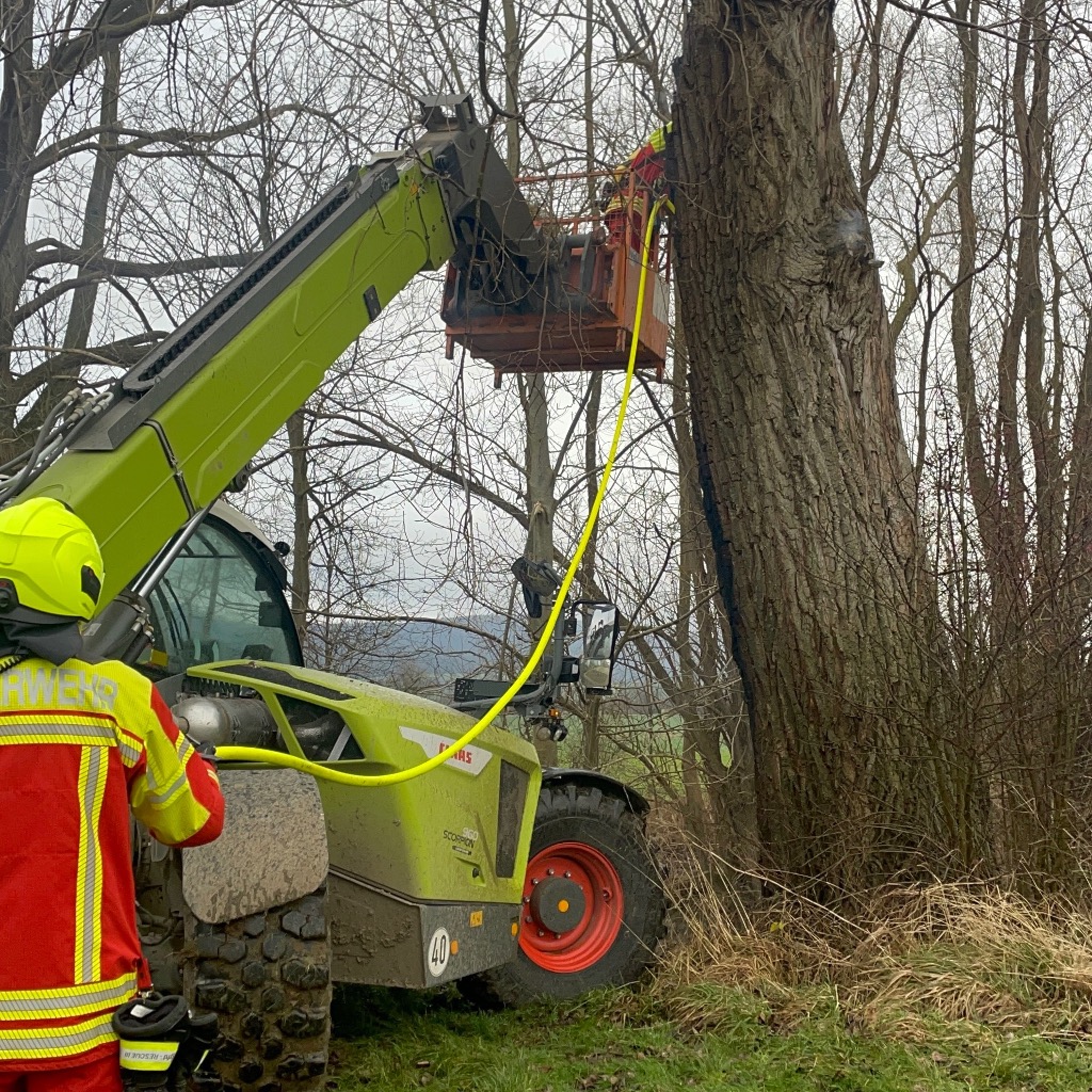 Dank der Unterstützung eines Landwirts, der uns mit einem Teleskoplader samt Korb zur Seite stand, konnten wir den Brand im Inneren des Baumes gezielt bekämpfen. Dabei setzten wir ein D-Rohr und eine Löschlanze ein, um die Glutnester effektiv zu löschen.
